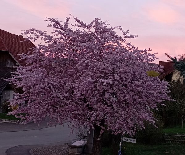 In voller Blütenpracht präsentiert sich die japanische Kirsche am alten Schulbrunnen
