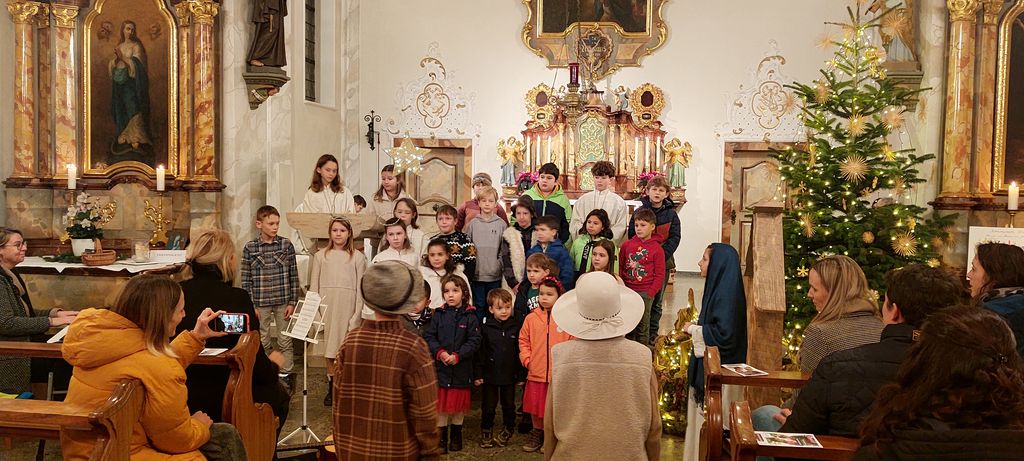 Unter Leitung einiger Mütter gestalteten die Kinder die Messe am hl. Abend in der Krenkinger Kirche. Eine Bläsergruppe spielte zusätzlich und die Kinder wurden von Nadine Hug am E-Piano bgleitet. Das volle Gotteshaus spendete den Kindern reichlich Applaus für den schönen Gottesdienst zu Weihnachten.